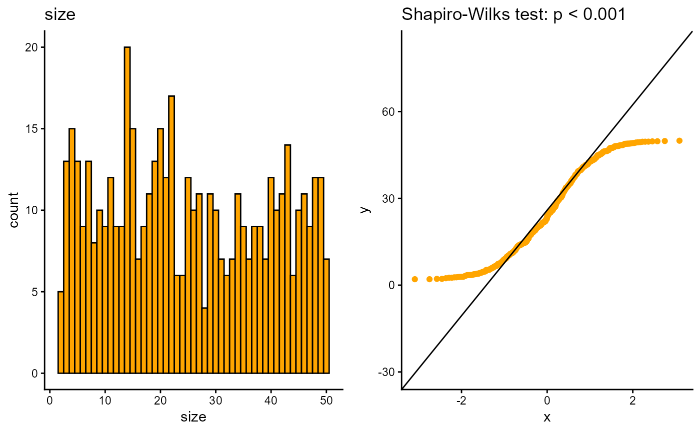 #> 7 ck 157We can also check if numerical variables are normally distributed with the distributR() function