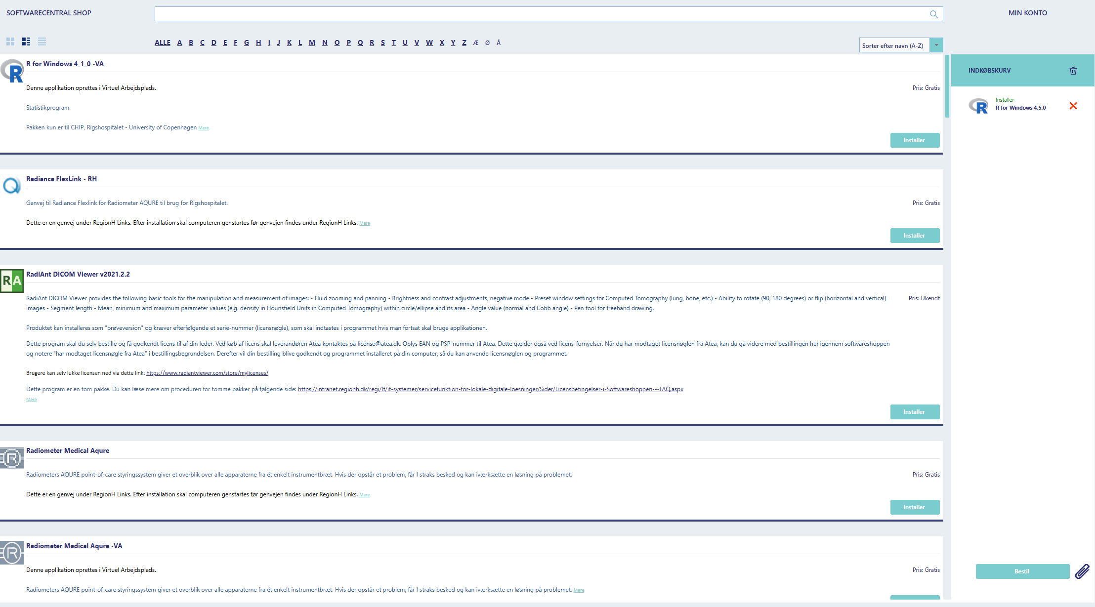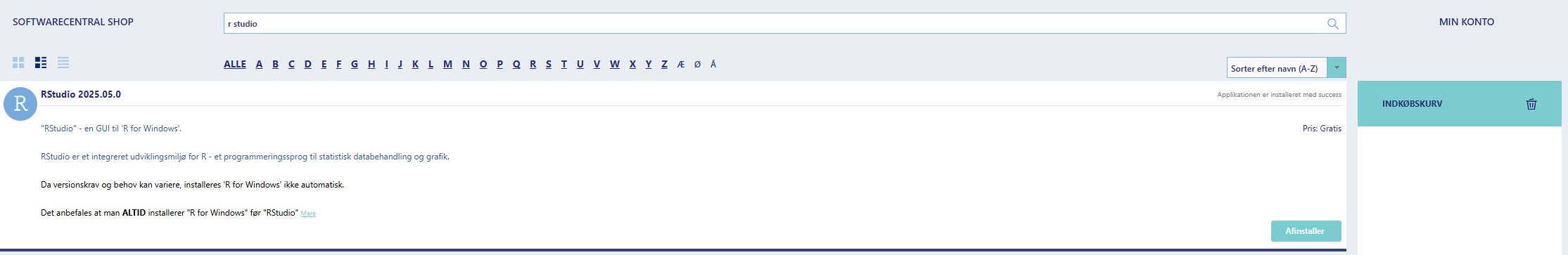 R is installed from softwareshoppen which is found at the desktop. Click “installer” and “bestil” and wait for 10 to 15 minutes.