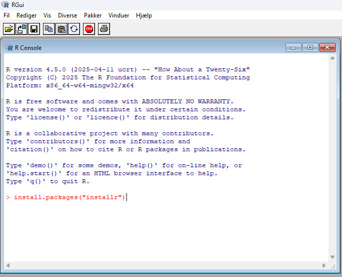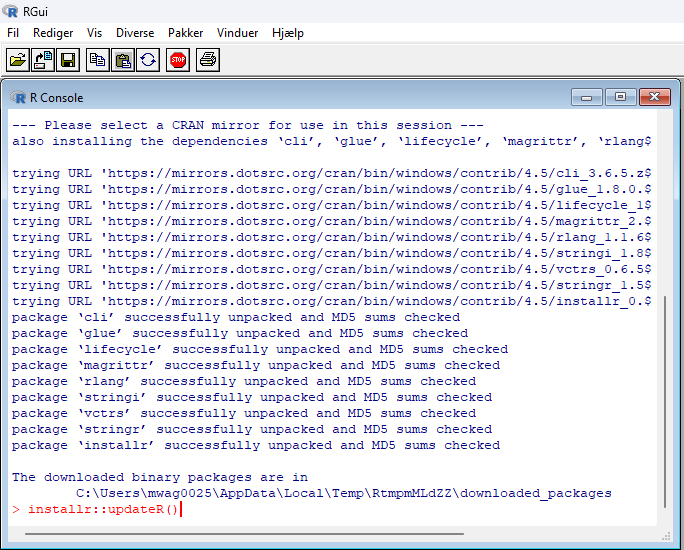 R can be updated directly in R, as softwareshoppen is not always up-to-date. This requires a specific package called “installr”. The installation needs to be run directly from R and not R-studio.