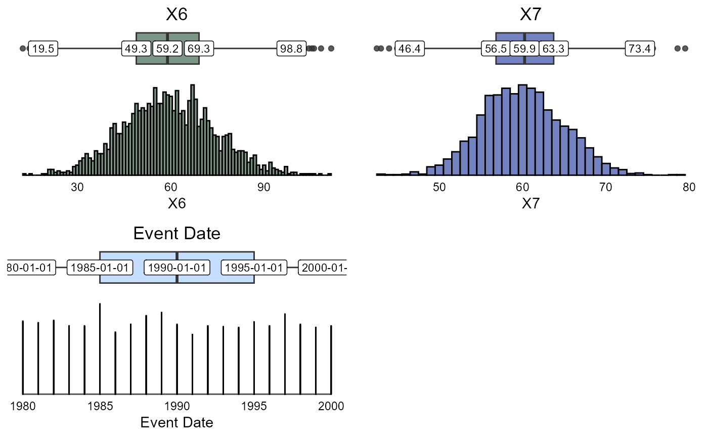 summarisR(data=df,vars=c(X6, X7, X1, X3), group = X2)